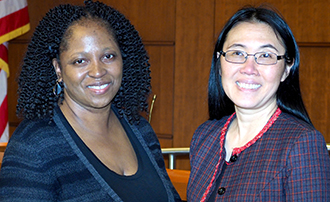 In the photo from left are Professor Olufunmilayo B. Arewa and Professor Xuan-Thao Nguyen. Professor Nguyen is Director of the IP Center at IU McKinney and the Gerald L. Bepko Chair in Law.