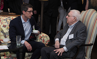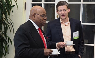 The guests enjoyed an opportunity to visit with classmates and former colleagues during a coffee hour before the luncheon. Current IU McKinney students also visited with alumni during the event. In the photo at left, the Reverend Franklin E. Breckenridge, Sr., '68, (left) chats with IU McKinney 2L Scott Probert.