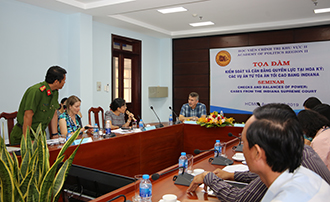Justice David taught U.S. contract law. While in Ho Chi Minh City, Justice David also gave a presentation to the Ho Chi Minh Academy on "Checks and Balances of Power: Cases from the Indiana Supreme Court." He also had the good fortune to spend a few days in Hanoi and Ho Chi Minh City, where he was able to visit with former students. Justice David teaches a course in contract law for LL.M. students at IU McKinney, and a course in evidence. "It was a remarkable experience to see McKinney graduates influencing and shaping tomorrow's Vietnam," Justice David said. In the photo, Justice David talks with one of the participants in the seminar he taught on checks and balances.