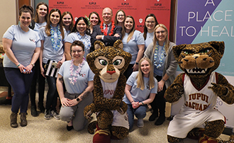 In the front row of the photo, kneeling, from left, are Taylor Pearson, IUPUI mascot Jazzy, Jordan Quillen, and IUPUI mascot Jawz. In the second row left are Tiffany Wire-Costley, Rani Amani, Sheremy Cabrera, Dean Andrew R. Klein, Mackenzie Johnson, and, Katie Speer. In the third row from left are Erin Bodnar, Jessica Bohling, Laura Blaydes, Paysen Corbett, Shelby Knop.