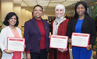 In the photo from left are Mahesha Tennekoon, Vice Dean Karen E. Bravo, Tamara Al Banna, and Ibironke Bunmi Ogunleye.
