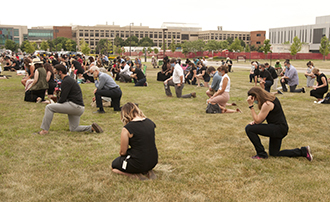 Members of the extended IU McKinney community—including law students, professors, alumni, attorneys and their families—gathered on the lawn at Inlow Hall to call for action and a renewed push for racial equality at an event on Friday, June 19.