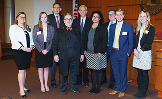 In the photo from left are IICLR Executive Managing Editor Klara A. Zierk; IICLR Editor-in-Chief Jessica Ayer, Robert J. Pavich of Pavich Law Group, Professor Jeffrey A. Van Detta, IU McKinney Professor Frank Sullivan, Professor Jenna Martin, Kent A. Yalowitz, Executive Symposium Editor Andrew R. Lang, and Executive Content Editor Veronica J. Schlib.