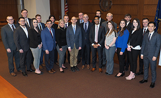 In the photo are members of the law review with presenters from the day’s event. In the back row from left: Andrew Kuhlenhoelter, Adam Eichelberger, Sean Farrell, Andrea Katz, Patrick Clark, Christopher Kratovil, Sam Szynal, Professor Frank Sullivan, Vitalli Buz, and Bradley Neely. In the front row from left are Sean Kilgore, Olivia Hess, Professor Eugene Mazo of Rutgers, Samantha Jordan, Professor Gerard Magliocca, Vice Dean Mike Pitts, Professor Richard Albert of the University of Texas at Austin School of Law, Lauren Scheid, Virginia Talley, Rachel Ehlermann, and Khoa Trinh.